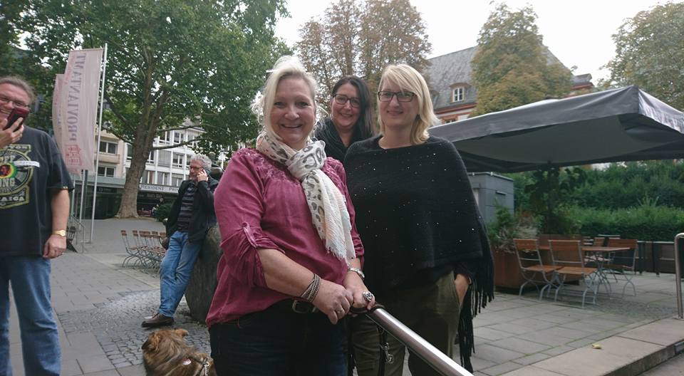 Nach 3 Stunden hatten wir zwar die ca. 300km bis Mainz bewältigt, allerdings haben wir in der Innenstadt ca. 40 Minuten gebraucht, um an unser Hotel zu gelangen. Das Navi sagte beharrlich „biegen Sie JETZT links ab“, nicht wissend, dass wir dann eine Absperrung gerammt hätten (wie ich diesen Tonfall lieeeebe!! 😡 und überhaupt.. doofes Navi, mach die Augen auf, dann siehst Du, dass die Strasse gesperrt ist 😅). Egal…! Wir kamen also nach etlicher Herumkurverei im Hotel an, bezogen unser Zimmer und machten uns dann auch gleich auf den Weg zum Treffen, das schon seit 2 Stunden im vollen Gange war.