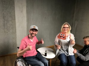 Wir waren eine kleine Truppe, 4 Betroffene (okay, mit Sabine zu fünft) und jeder hat so seinen eigenen Stil in diese Produktion eingebracht. Ich lernte Marie kennen, die mit ihrer Herzlichkeit und Offenheit einfach eine Strahlefrau ist – man denkt wirklich nicht, dass sie schonmal im Rollstuhl saß und aufgrund einer Fehlberatung ihres Arztes einen mehrere Monate andauernden „Leidensweg“ hinter sich hat.