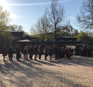 Der Tag begann mit warten, denn die 400 Komparsen mussten alle erstmal registriert werden. Es bildete sich eine lange Schlange aufgehübschter Menschen vor dem Festspielhaus und einige Schüler der nahegelegenen Realschule und auch Gassigeher dachten sich sicherlich: „was bitte ist hier los?!?“